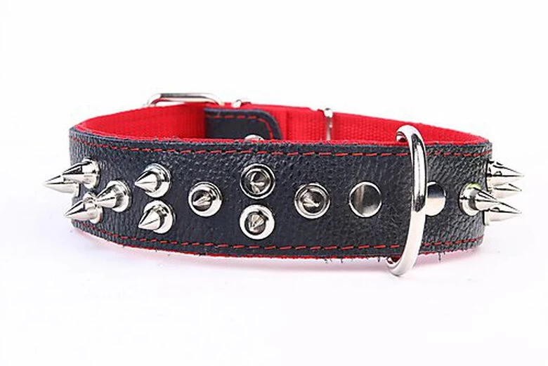 Collier de haute qualité en cuir véritable, ruban en nylon coloré et pointes fixés au cuir pour chien. Chaque collier comprend un anneau en D solide et soudé. Les matières premières utilisées pour la production proviennent de fournisseurs européens.