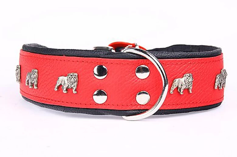 Collier avec ornement de bulldog anglais en cuir véritable sur le dessus et cuir nappa véritable de haute qualité sur le dessous. Anneau en D solide et soudé.